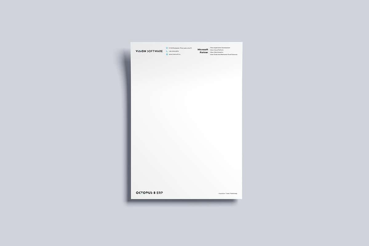 Kiemelt figyelmet kapott a Vision Software fő terméke, az Octopus 8 ERP is. A termék saját, egységes vizuális megjelenést kapott, amely harmonikusan illeszkedik az anyamárkához, mégis önálló karakterrel bír. Az arculatot tovább vittük a levélpapíron, a beállítási segédletekben, a termékbeállítási útmutató borítón, valamint a social media borítóképeken is.